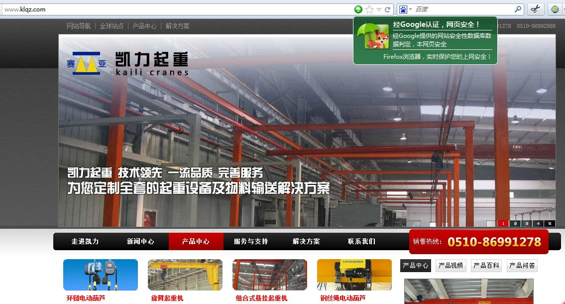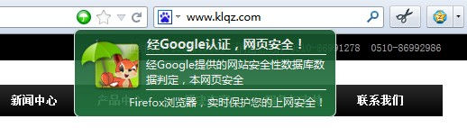 当您使用“Mozilla Firefox火狐浏览器”10版本浏览“凯力起重公司网站www.klqz.com”的任意网页时,均会在浏览器的地址栏看到一个“小雨伞”的绿色图标,当将鼠标移动到图标上方时,会弹出“Google网页安全认证”的认证标识及相关说明——“经google认证,网页安全。经Google提供的网站安全数据库数据判断,本网页安全。”