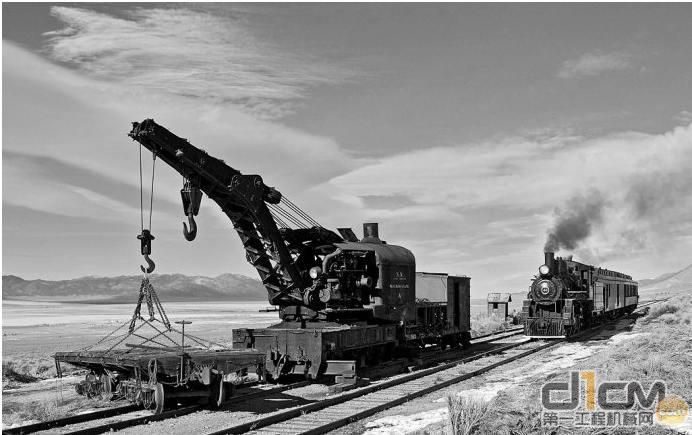 100年前使用的铁路蒸汽起重机,正在清除铁路上的障碍物。